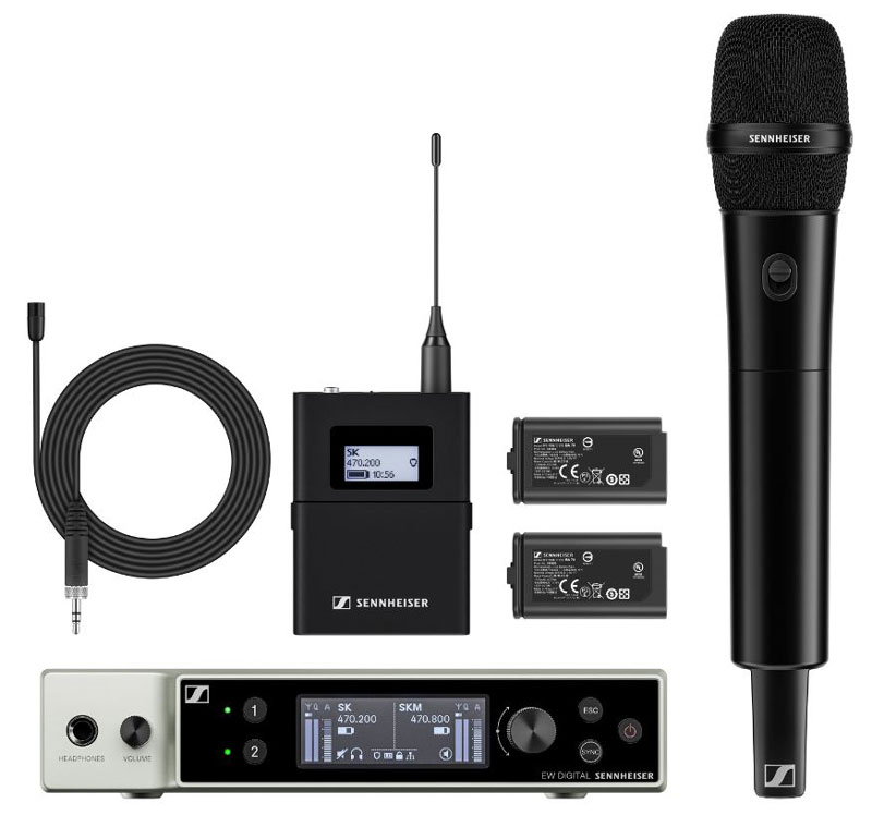 这个组合套装包含如下:1个 EW-DX SKM-S (手持话筒带静音开关), 1 个 MMD 835 音头单元(心形指向, 动圈), 1 个 EW-DX SK (无线腰包发射器), 1 个 MKE 2 (全指向领夹麦克风), 1 台EW-DX EM 2 机架式接收机 (2 通道) 和 2 块BA 70 可充电电池组